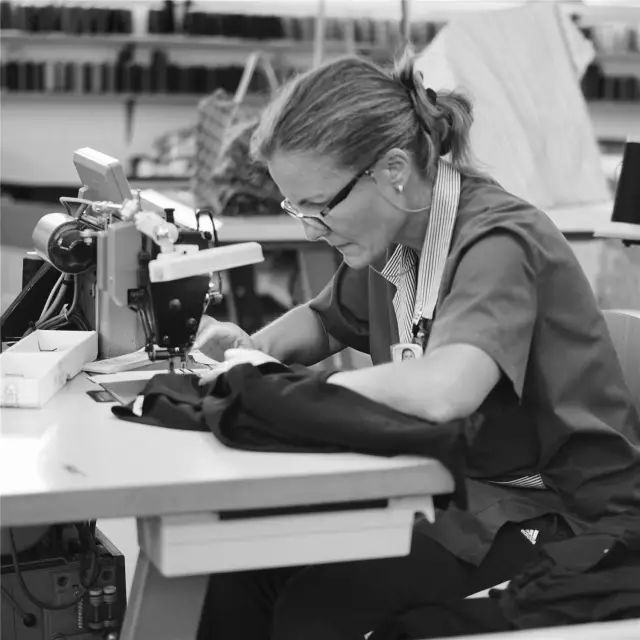 比如面料的检验分为三个阶段:人眼检验、跳针抽检、残次手工调整以及再次核实检验。下图为人眼检验,经验丰富的女工专注精神,一厘米也不会放过跳针,她手握一只梭针,手起针翻飞,随时快速修正。