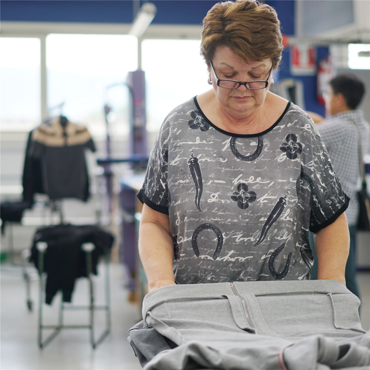 只见各个工段之间划分科学严谨,设备工艺周全先进,做工精良,最为突出的是衣服内侧多以18针超细针织收尾,工整细腻。