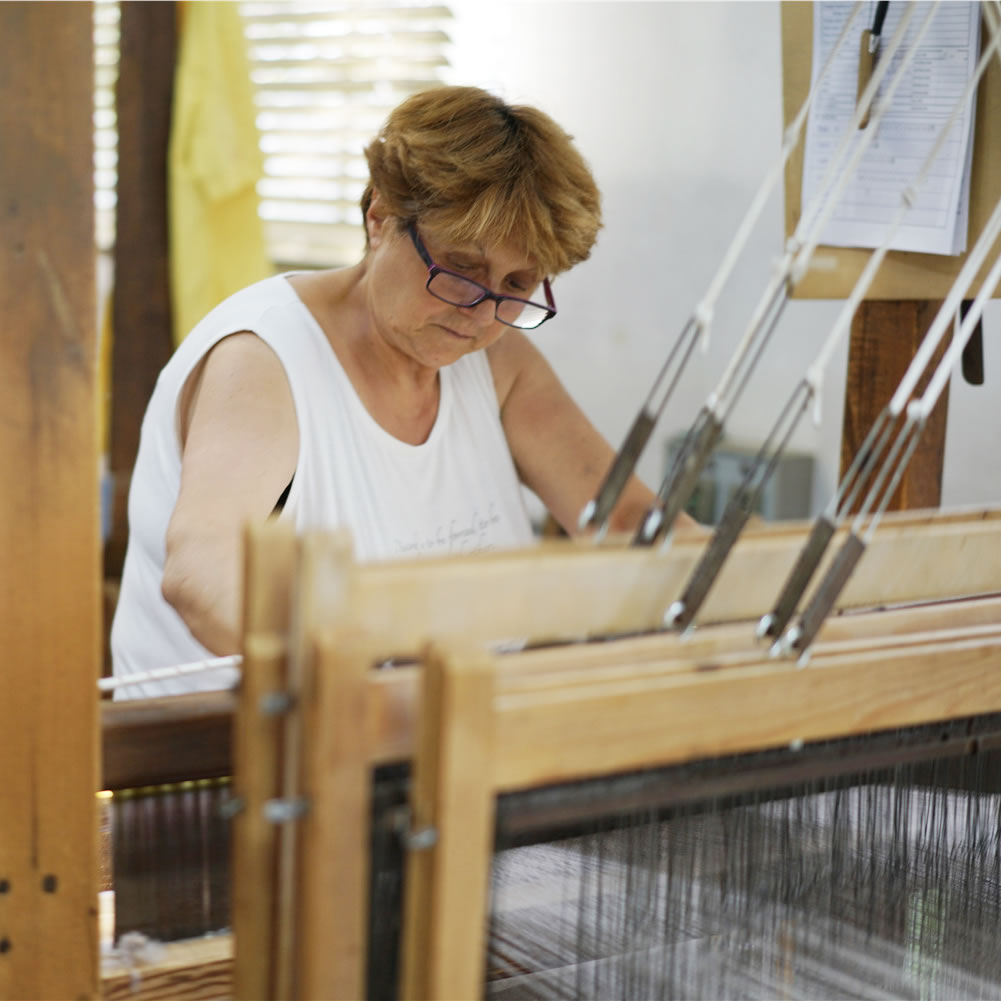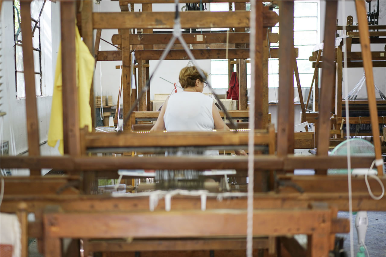鲜花盛开的铁门之后,是保存至今的手工作坊,至今仍有一个系列的羊毛围巾使用纯正古法织造工艺,这位孤独的妇人一周只能完成40件产量。