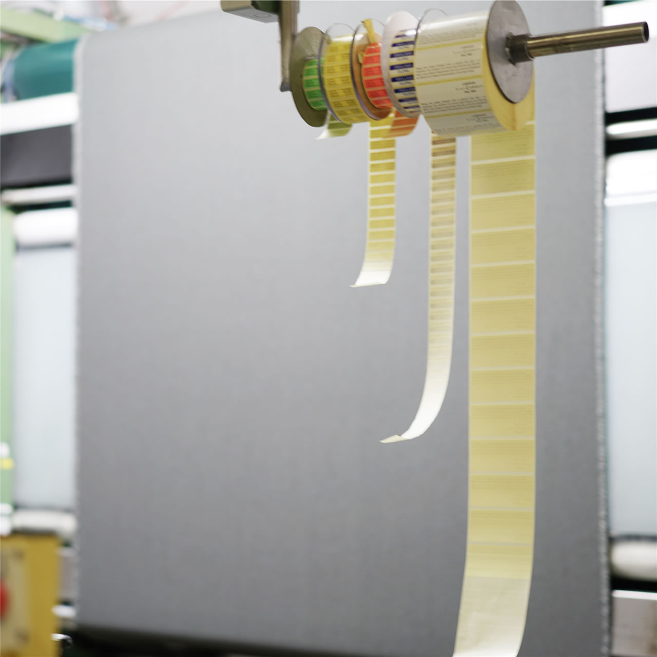 你看到这些粘纸小标签吗?这些尺寸与颜色不同的标签代表着不同定义,将被精准的贴在不同程度的面料瑕疵边上,以方便下一个流程的工人决定这片面料的去处。